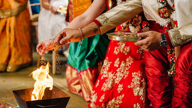 The wedding ceremony is a sacred event where traditional rituals are performed to unite the bride and groom. It includes rites such as the exchange of vows, the seven sacred steps (saptapadi), and the symbolic tying of the nuptial knot.